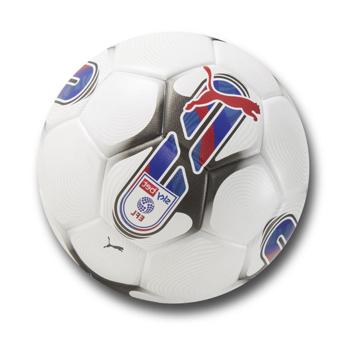 The Puma EFL Sky Bet Orbita 3 Ball is a high performance training and low-level match ball that features competition branding and a rubber bladder. It is based on the ball used in Soccer League fixtures and features EFL branding. The ball has a classic 32-panel construction that provides a soft, consistent touch. It also has a thermal bonded cover and is available in size 5.