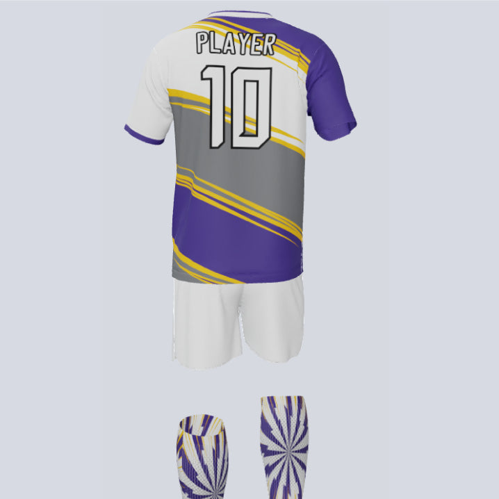 "Step up to the plate with our Custom 'Swing' soccer uniform set! This dynamic ensemble is ready to hit it out of the park, fully customizable to match your team's distinct style. Whether you're dribbling down the field or going for a goal, this awesome custom soccer uniform will exceed your expectations. Unleash your creativity and design a look that's uniquely yours, amplifying your team's spirit and taking your team pride to new heights. With customizable jerseys and socks, you'll stand out on and off the field. And with advanced moisture-wicking technology, you can stay cool, dry, and focused, maintaining your winning momentum. Don't just play the game, own it with our 'Swing' soccer uniform set!"
