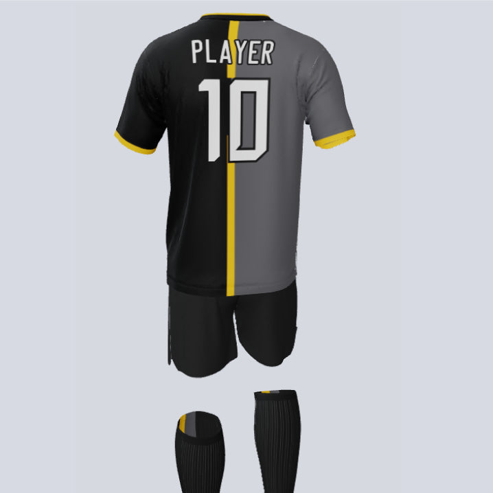 "Elevate your team's game with our Custom 'Classic' soccer uniform set! This iconic ensemble is more than just a uniform—it's a canvas for you to unleash your creativity and showcase your team's style. With limitless customization options, you can create a design that's truly timeless and represents your team's unique spirit. Trust us, investing in this remarkable custom soccer uniform will leave a lasting impression on and off the field. It's your chance to make a bold statement and take your team pride to the next level. And with advanced moisture-wicking technology, you can stay cool, dry, and focused, giving you the winning edge. Don't settle for ordinary, embrace the 'Classic' and make your mark in style!"