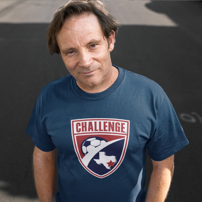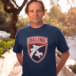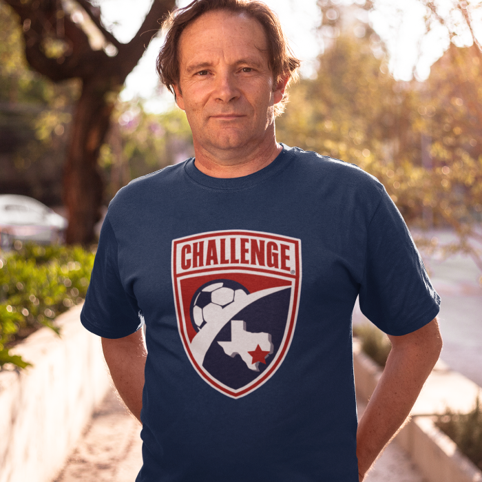Introducing the "Dad Challenge Shield T-Shirt" from Challenge Soccer Club. This vibrant red shirt features the club crest, symbolizing unwavering support for young athletes. Made for comfort and durability, it's the perfect way for dads to show their pride on and off the field. Join the legacy and embrace the challenge in style.