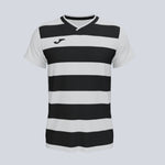 Short sleeve jersey with a ribbed v-neck. It has printed horizontal stripes. Printed J logo.