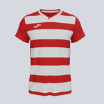 Short sleeve jersey with a ribbed v-neck. It has printed horizontal stripes. Printed J logo.
