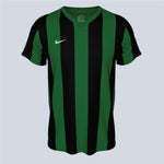 Dri-FIT knit short-sleeve uniform with a ribbed V-collar, featuring a graphic front panel with gradient stripes. It includes a mesh back panel, an embroidered Swoosh logo, and an authentic woven Nike jock tag.