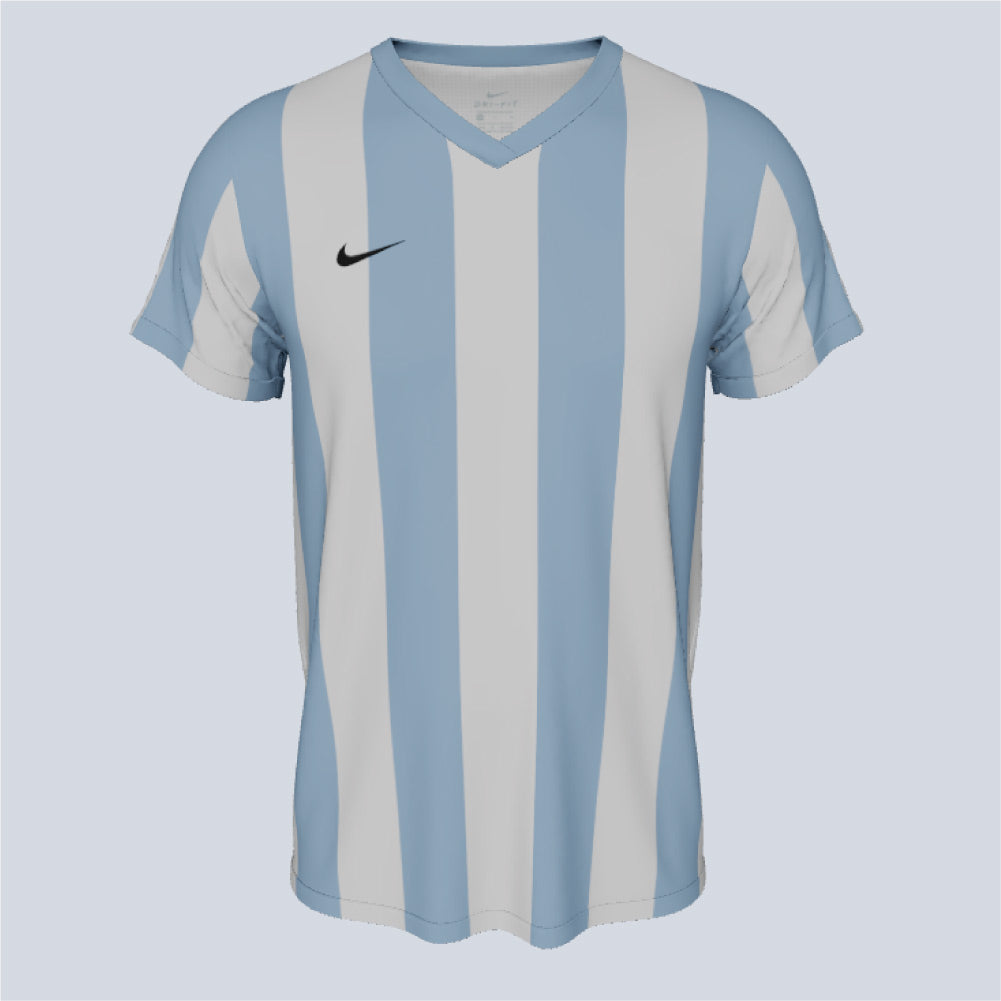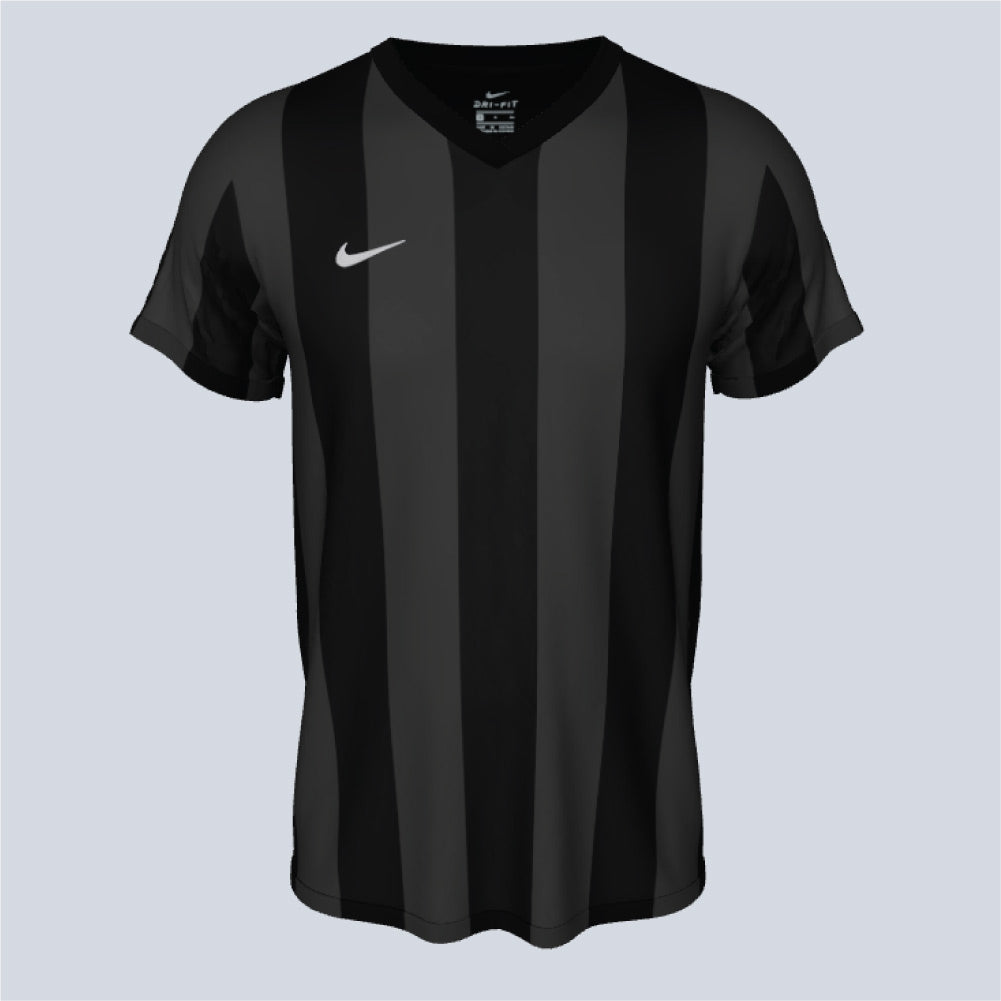 Dri-FIT knit short-sleeve uniform with a ribbed V-collar, featuring a graphic front panel with gradient stripes. It includes a mesh back panel, an embroidered Swoosh logo, and an authentic woven Nike jock tag.