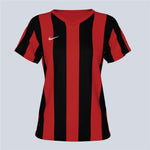 Nike Women's Dri-FIT knit short-sleeve uniform with a ribbed V-collar, featuring a graphic front panel with gradient stripes. It includes a mesh back panel, an embroidered Swoosh logo, and an authentic woven Nike jock tag.