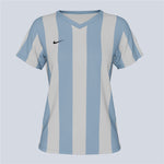Nike Women's Dri-FIT knit short-sleeve uniform with a ribbed V-collar, featuring a graphic front panel with gradient stripes. It includes a mesh back panel, an embroidered Swoosh logo, and an authentic woven Nike jock tag.